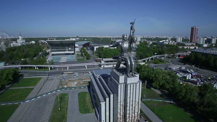 Всемирно известным символом СССР стал именно этот монумент, его изображение можно было увидеть на разнообразных открытках, марках, прочей советской продукции, а киностудия «Мосфильм» сделала его своей заставкой. Эта скульптурная композиция была заказана государством для оформления советского павильона на проводившейся в 1937 году международной выставке во Франции. Елена Мухина изобразила героев своего времени — молодых людей из ведущих политических классов советского общества — молодого мужчину рабочего и женщину колхозницу. В синхронно вытянутых верх руках они держат молот и серп. Скульптура словно говорит, что они строят мирную жизнь и стремятся к простому счастью.