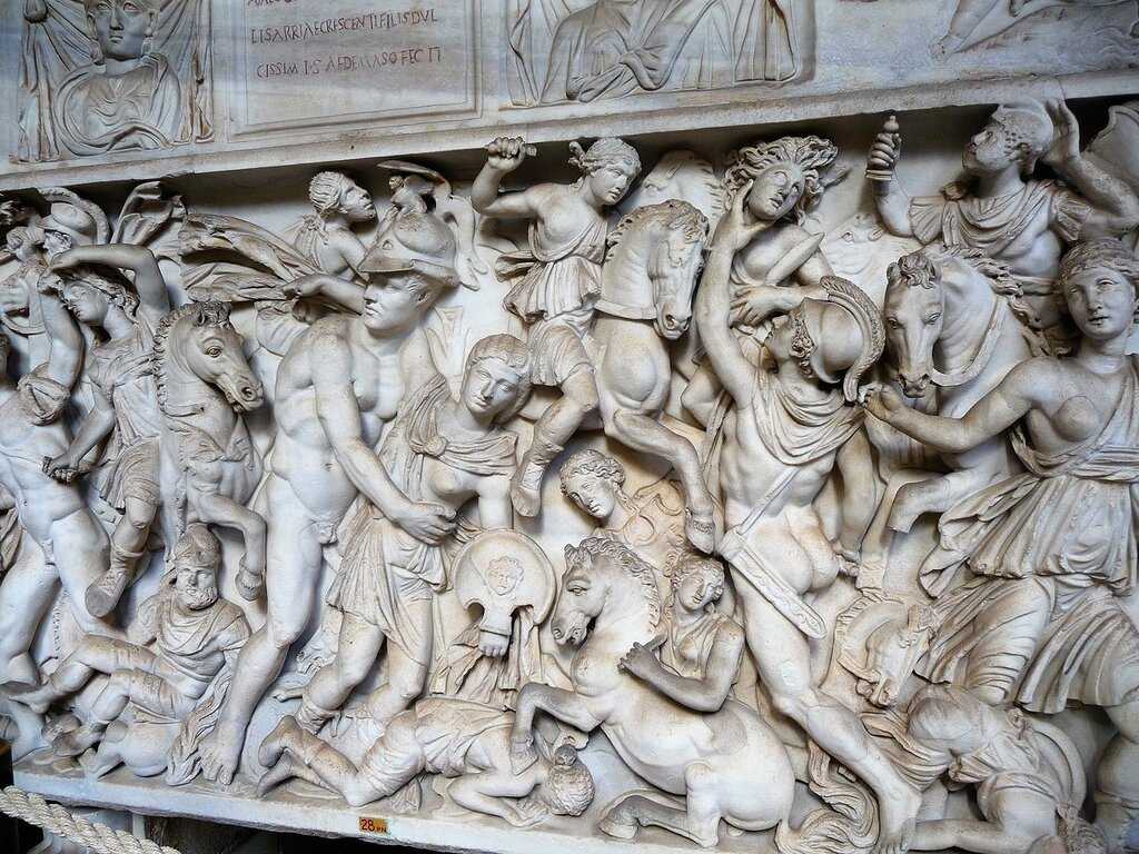 Большого искусства достигли древние римляне и в барельефах, большая часть которых была на саркофагах, на которых реалистически изображались не только сцены воинских сражений, но и обыденная жизнь, например, свадьбы.