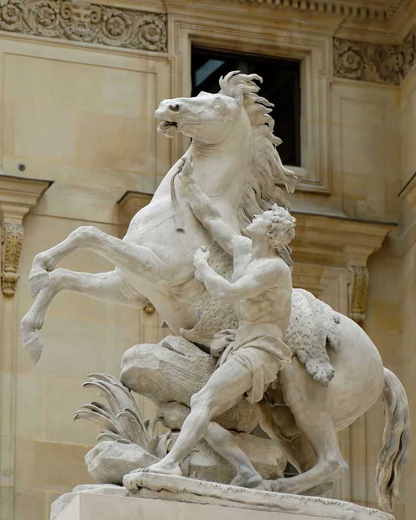 Заказ выполнял Гильом ле Кусто в 1739 – 1745 г.г. В результате скульптура заиграла мышцами дикого мустанга и голого укротителя, олицетворяя жестокую борьбу неистовой природы и человека.
