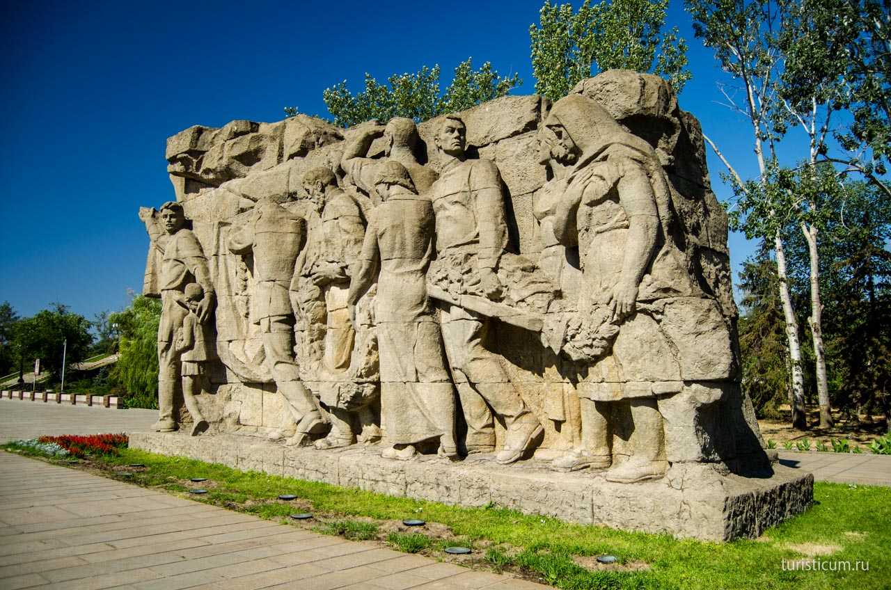 Если вы хотите попасть в Зал Славы, то перед этим все посетители кургана проходят по аллее рядом с бассейном, летом он всегда наполнен водой. Площадь воинов поделена на 2 части. По правую сторону расположены группы скульптур и памятников. Количество их в этом месте составляет шесть штук, выполнены они все из бетона, приблизительная высота каждой – 6 метров. Они смогли отобразить в себе события той страшной войны.