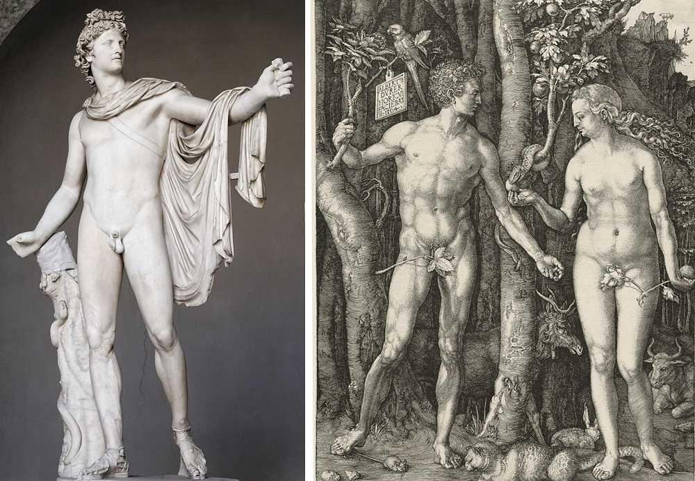 Дюрера увлекает желание найти идеальные пропорции фигуры человека. Он тщательно исследует обнаженные тела людей. В 1504 году создаёт выдающуюся гравюру на меди «Адам и Ева». Для изображения Адама художник берёт за образец позу и пропорции мраморной статуи Аполлона Бельведерского. Это античное изваяние было найдено в конце XV века в Риме. Идеализация пропорций отличает работу Дюрера от принятых тогда средневековых канонов. В дальнейшем он всё же предпочитал изображать реальные формы в их разнообразии.