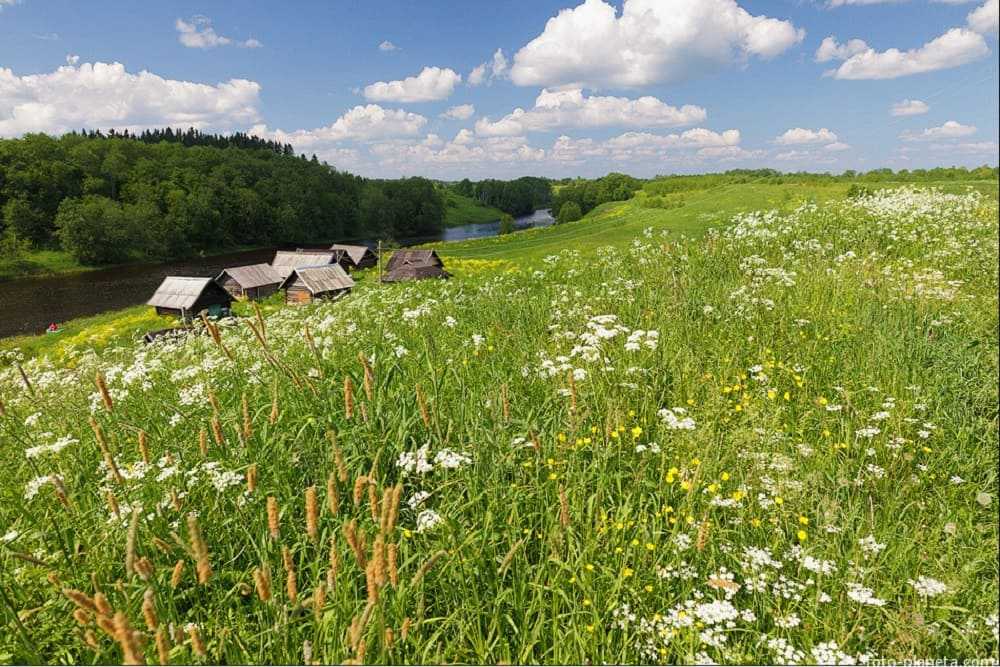 Летний день. Ярко светит солнце, освещая своими лучами голубое небо, зеркальную речку, зеленые берега, лесистые холма, далекую пашню… Вот стоит ряд крестьянских домишек с огороженными частоколом огородами. Крестьянка несет воду с речки. Деревня живет своей незатейливой жизнью, которая тесно связана с природой.