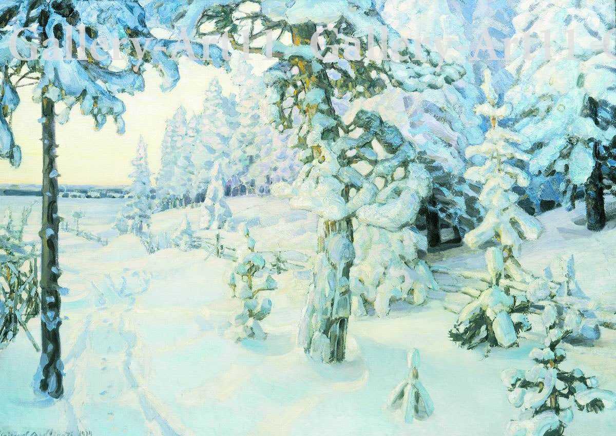 Пейзаж этот получил вполне заслуженную медаль на выставке, которая проходила за границей. Мы видим таинственную опушку сказочного леса. Всю ее сковал лютый мороз.