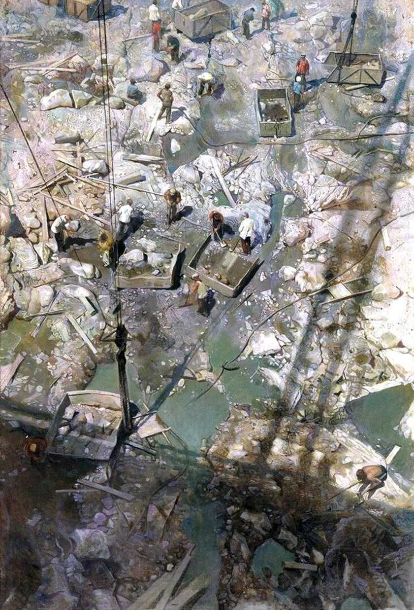 В это время часто изображаются гигантские строительства, индустриальные темы, в которых присутствует гиперболизированность.