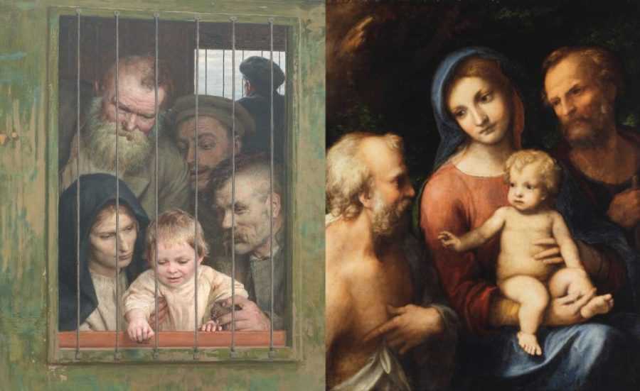 Слева: Николай Ярошенко. Всюду жизнь (фрагмент). 1888. Третьяковская галерея. Справа: Корреджо. Святое семейство со святым Иеронимом. 1519. Замок Хэмптон Корт, Лондон.