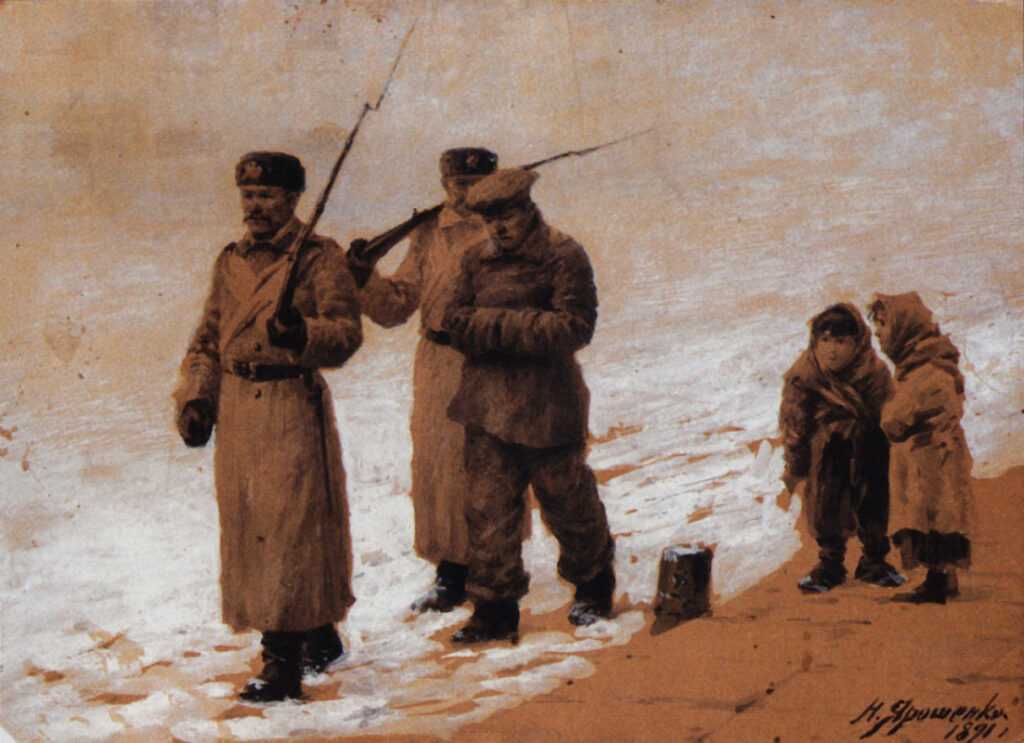 Арестованного ведут. 1891 Картон коричневый, белила.