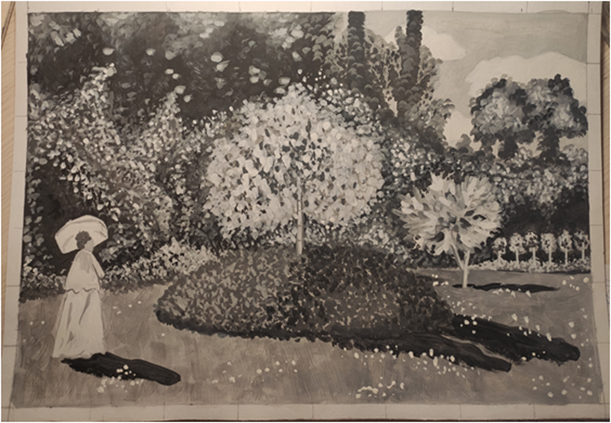 Рисунок 2. Картина в моем исполнении «Дама в саду Сент-Адресс» в тональной разработке.