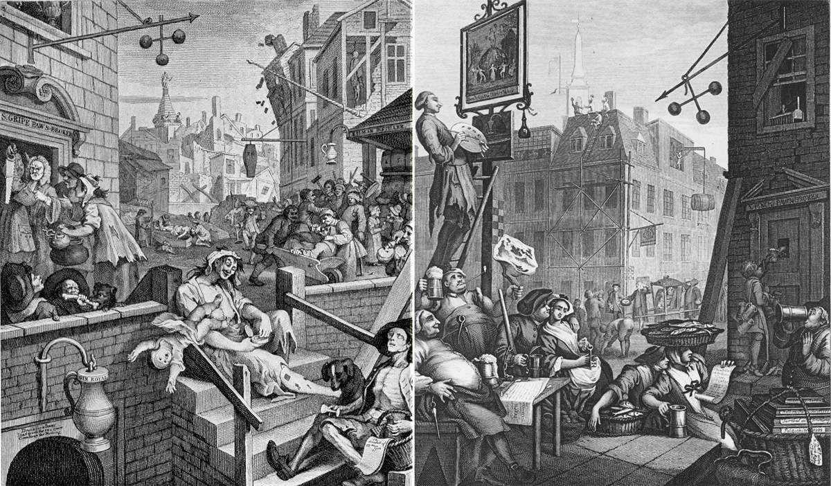 Если сравнить их, то становится очевидно, в пользу какого напитка сделал выбор Хогарт. На Улице пива здоровые, сильные люди строят новые дома, и единственное здание, находящееся в упадке, это лавка ростовщика (ее знак — три золотых шара), т.к., видимо, жители улицы неплохо обеспечены и без него. В Водочном же переулке все совсем наоборот: ростовщик процветает, к нему выстроилась очередь, а кругом творятся всякие непотребства и ужасы — пьяная мать роняет ребенка и не замечает, что ее саму грызет собака; дома разрушаются, люди дерутся и убивают друг друга и т.п.