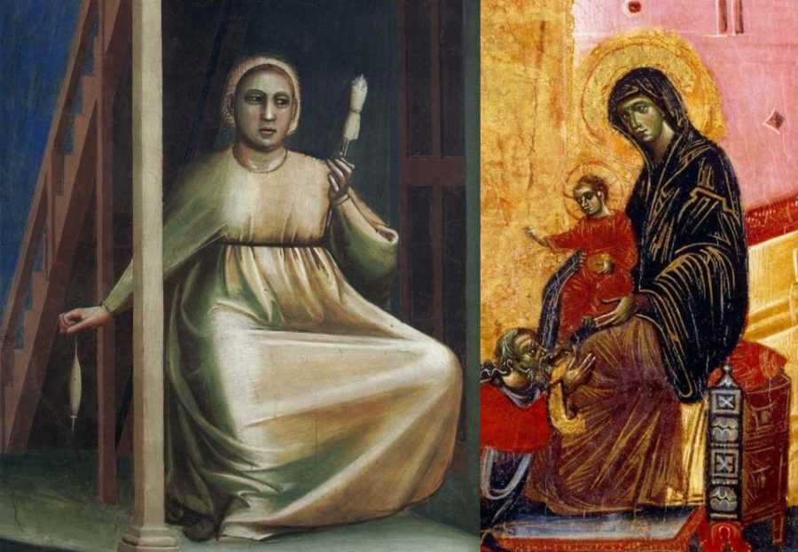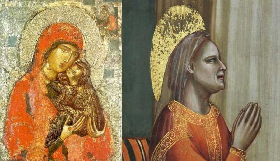 Слева: неизвестный сербский мастер. Икона “Святая Анна с младенцем Марией”. 14 век. Загорский музей-заповедник, г. Сергиев-Посад, Россия. Справа: Джотто. Святая Анна.