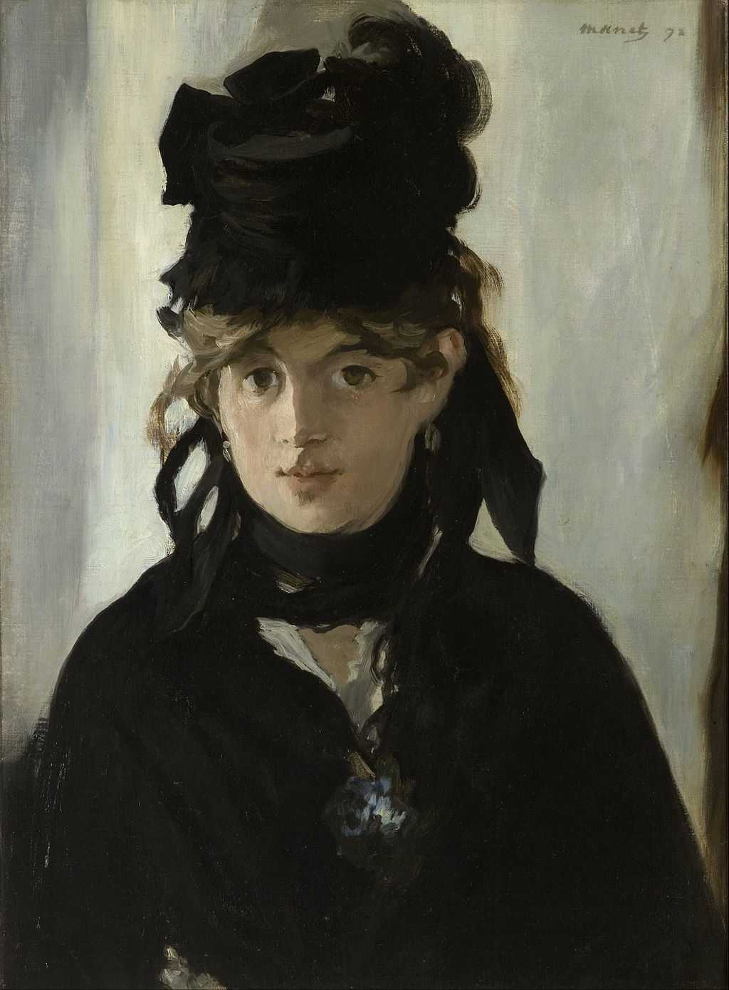 Мане начал расширять свою цветовую палитру под влиянием пастельных пейзажей импрессионистов, но он никогда полностью не отказывался от своей тяги к черному, что проиллюстрировано здесь в портрете его близкой подруги, художницы Берты Моризо. В отличие от других его картин, которые в основном написаны при равномерном освещении, Мане решил осветить здесь только половину лица Моризо, создав драматическую игру света и тени. Она держит букет фиалок, которые сливаются с темной складкой ее платья. Почитатели творчества художника считали эту работу шедевром, и французский писатель Поль Валери в своем предисловии к каталогу ретроспективы Мане 1932 года в Музее Оранжери (Musée de l’Orangerie) написал: «Я не ставлю ничего в творчестве Мане выше, чем портрет Берты Моризо, датированный 1872 годом. . »