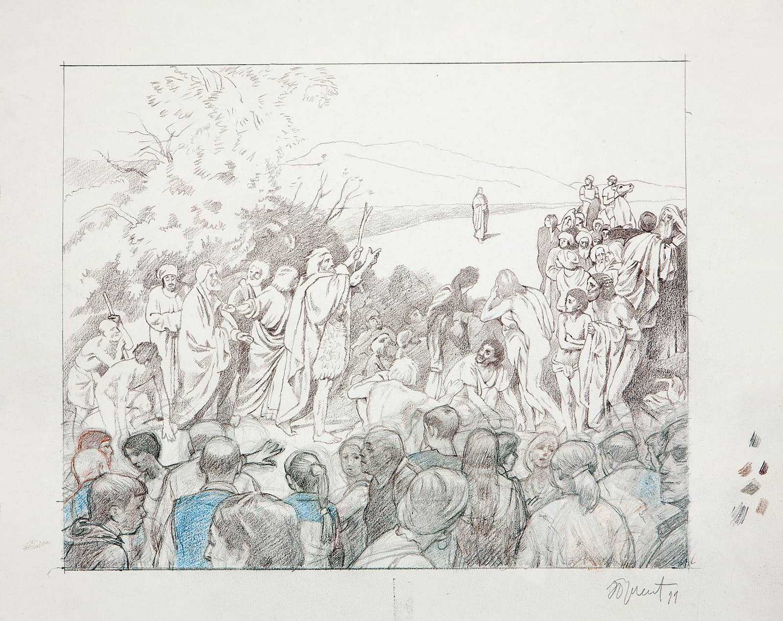 Дело в том, что в картине Александра Иванова уже существует деление на картину и зрителей: картина — идущий Христос, а группа людей на переднем плане — зрители, которым Иоанн Креститель прямо указывает, куда надо смотреть. Когда я помещаю современных зрителей на первый план изображения, зрители Иванова тотчас же становятся персонажами и граница между картиной и нами удваивается и делается проницаемой. А когда к полотну подходит новый ряд уже живых зрителей, граница повторяется в третий раз и становится эфемерной, исчезает. Возникает анфилада пространств, открытых в сторону зрителя. То ли мы входим в картину, то ли она нисходит к нам. Граница между жизнью и искусством исчезает. Задача исчезновения границы, конечно, чисто концептуалистская, но способ её реализации тут традиционно реалистический. И это как раз и есть моя задача — соединять, собирать, связывать.