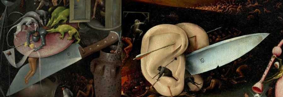 В аду Босха мы видим несколько гигантских ножей. Во времена художника ножи использовали не только на кухне, но и для наказания воров. Им отрезали уши. Поэтому неудивительно, что ножи присутствуют в Аду с гигантскими ушами впридачу.