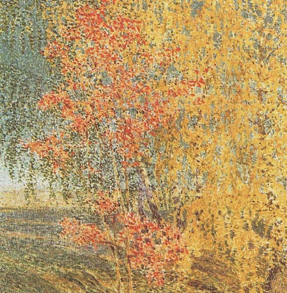 Полотно «Осень. Рябины и березы» (1906 г.) создавалось под впечатлением произведений импрессионистов. Мастер создает настоящее чудо при помощи небрежных, слегка размытых мазков желтоватого, коричневого и пурпурного оттенков. Живописец восхищается чудесной порой и заставляет сделать это зрителя. Здесь даже не конкретное изображение золотой осени, а впечатление автора от увиденного. И этот восторг передается публике, которая не проходит равнодушно мимо картины. Кажется, еще немного, и можно услышать тихий шелест листвы высоких березок, ощутить на себе последнее тепло осеннего солнышка. Мастер играет с красками, стараясь передать свежесть и прозрачность воздуха, и это ему удается.