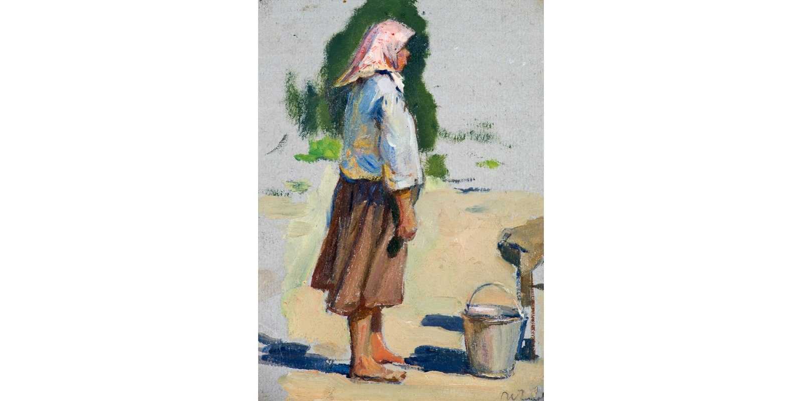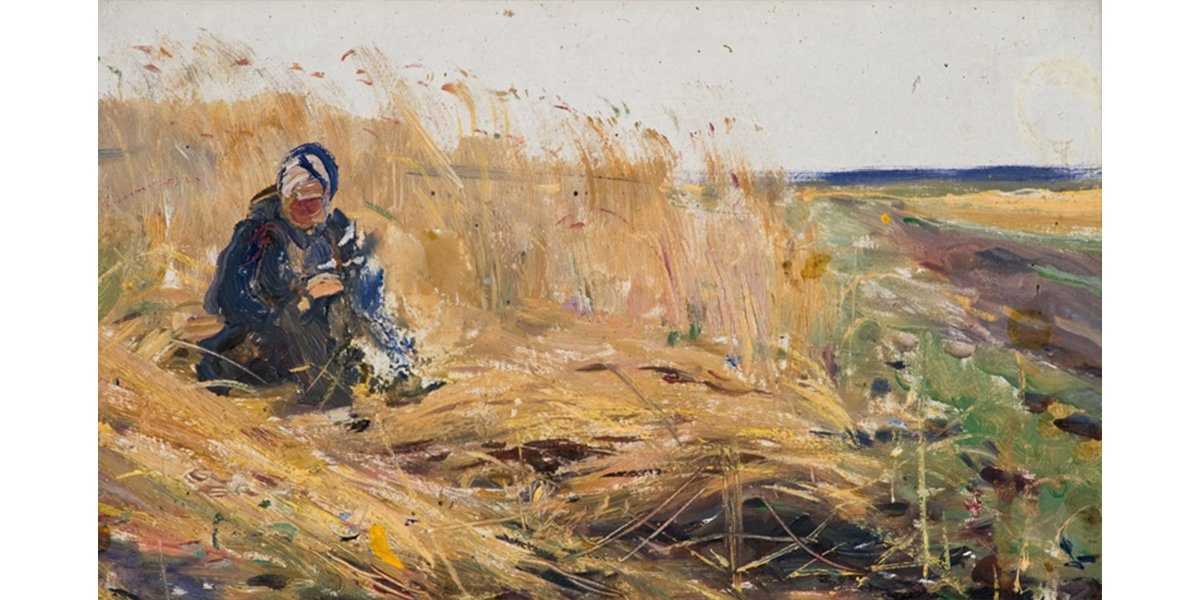 «Середина лета» для меня как середина лет, середина жизни. На заднем плане картины избы, кто-то косит, идет согбенная фигурка с косой – это напомнило мне и жизнь и смерть в буквальных символических фигурах. Короткое, но жаркое северное лето. Женщина стоит и ищет видимо своего мужа, от которого остался один мотоцикл в траве. Мальчик смотрит за птицами, пока мама кого-то высматривает. Я видел такие сцены, но это собирательный образ моего ощущения от того года. Мне хочется сохранить для себя те впечатления от жары, комаров, северных женщин с красивыми обветренными лицами.