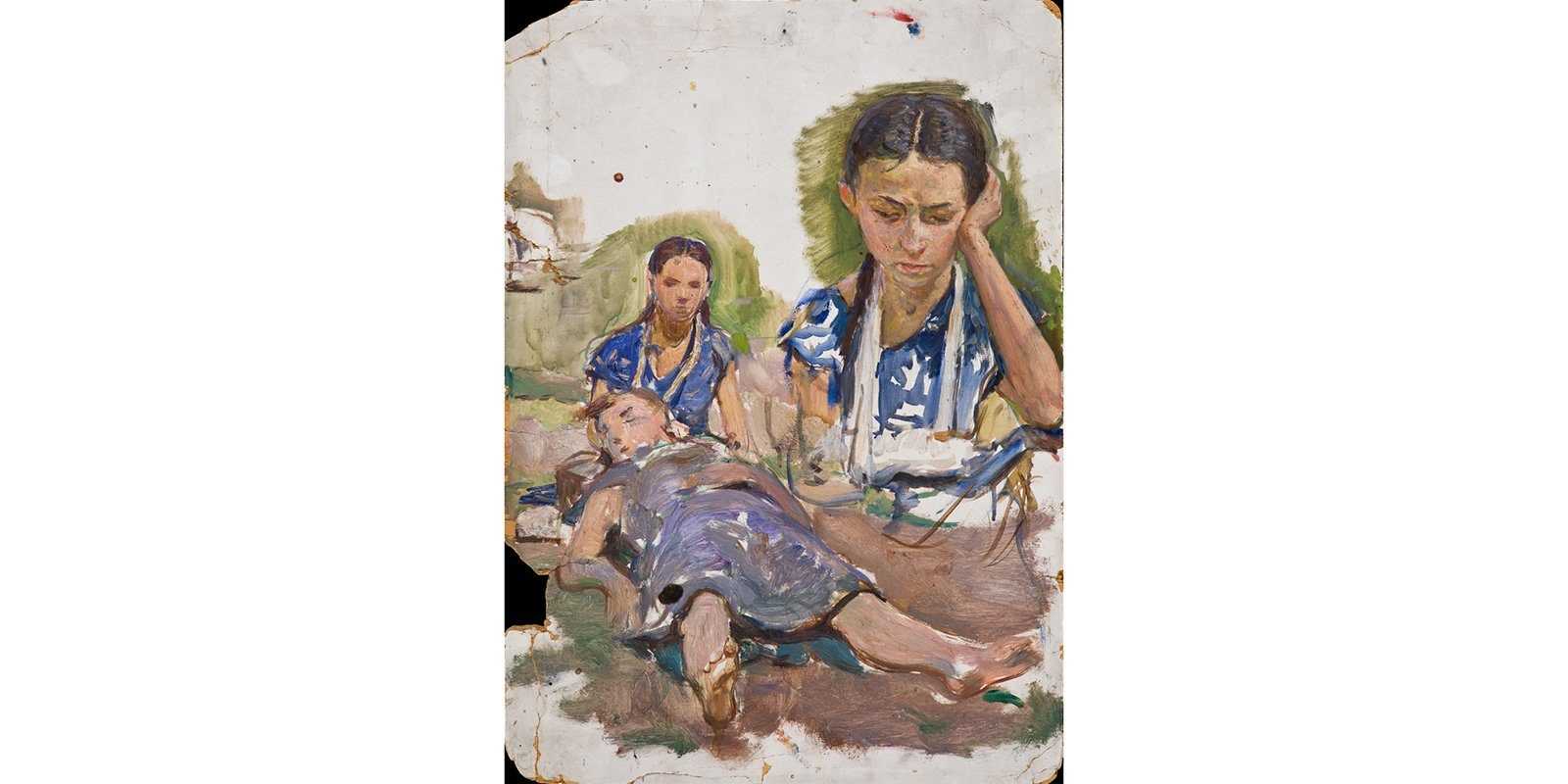 Работа «Дороги войны», изображающая отступающую Красную армию в 1941 году (1957). Не сохранилась до наших дней; художником позднее исполнена авторская копия.