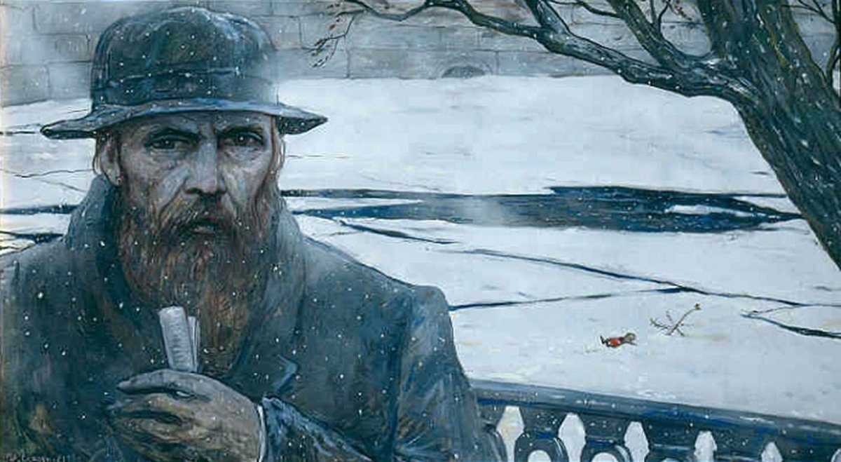 «Большой лоб с могучими, как у новгородских соборов своды, надбровных дуг, из-под которых смотрят глубоко сидящие глаза, исполненные доброты и скорби, глубокого раздумья и пристального волевого напряжения. Болезненный цвет лица, сжатый рот, сокрытый усами и бородой. Его трудно представить смеющимся», – описывал художник Достоевского в своей книге «Россия распятая».