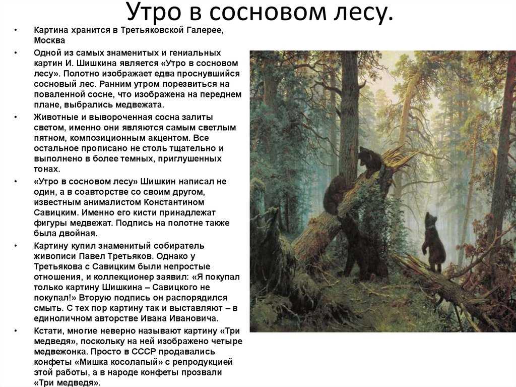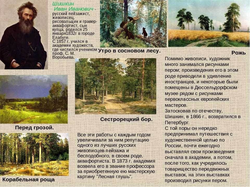 Каждая картина Ивана Ивановича Шишкина переполнена любовью к родному краю и природе, ее бесконечной красоте и величию. Тщательная прорисовка всех деталей произведения искусства характерна для данного автора. Благодаря этому реалистичность его работ