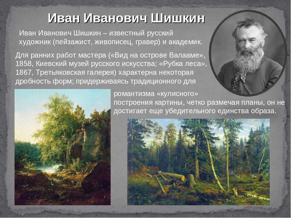 Иван Иванович Шишкин занимает одно из самых почетных мест в русской живописи. Рисовал он только пейзажи, изредка разбавляя их животными и птицами; характерный, подробный стиль художника запоминается сразу и забыть его уже