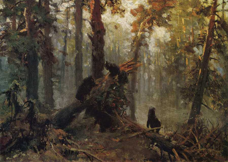 Сосна, на которой играют медвежата, сломана надвое. Одна часть полувыворочена из земли, застыв наклоненной. Другая половина лежит на земле. Это старая сосна, и она была сломлена под сильным ветром. Ее изображение дополняет впечатление от созерцания глухого уголка природы.