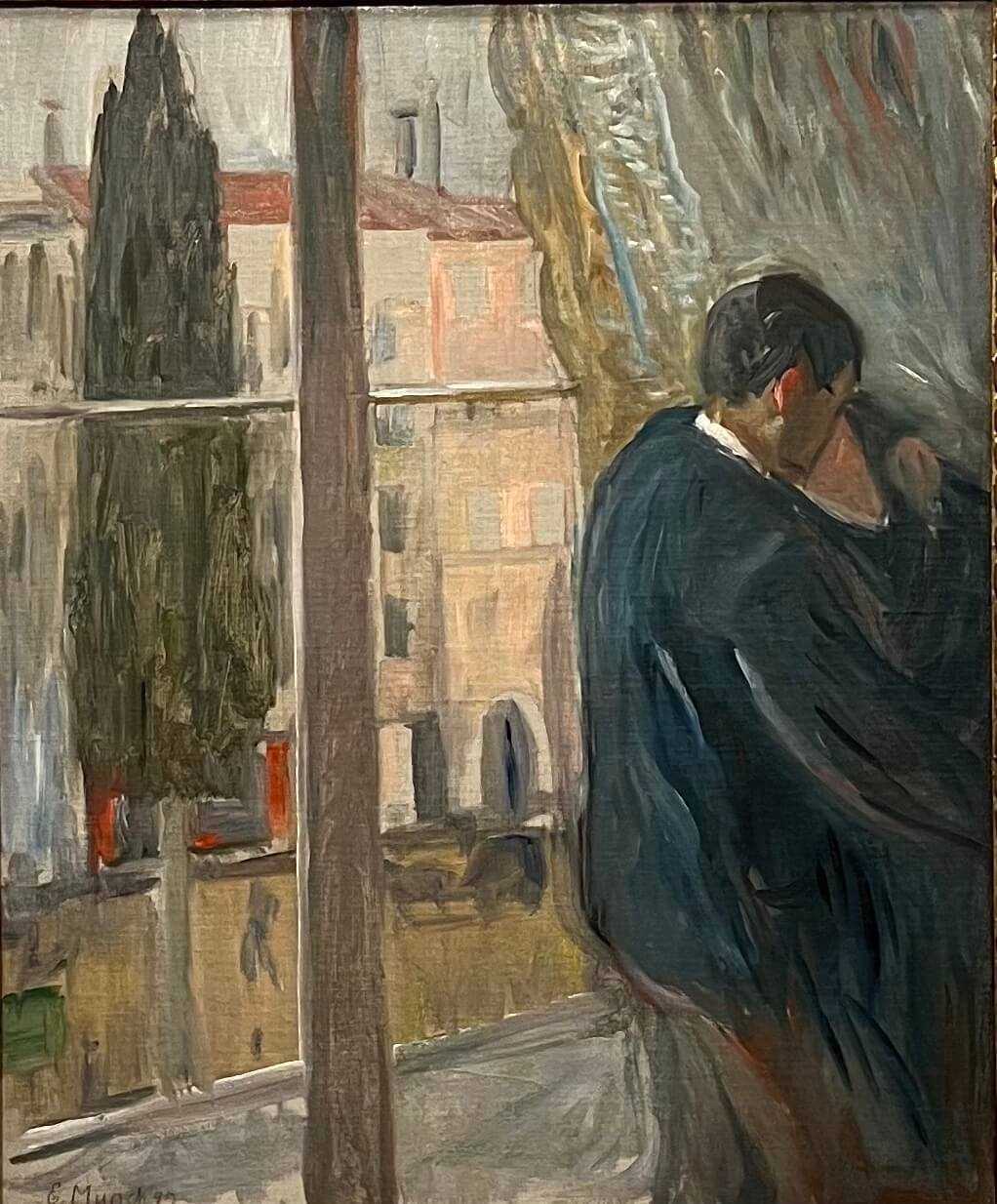 Во время пребывания в Ницце в 1892 году Мунк выполнил три версии картины «Поцелуй». Оттенки синего и сгущающиеся сумерки символизируют смерть, невидимо, но неизменно следующую по пятам за жизнью. Шторы отделяют интимный мир любовников от улицы — внешнего мира. Над этим сюжетом Мунк работал, уже будучи художником, пережившим влияние импрессионистов и сформировавшим свой способ выражения переживаний. «Природа меняется в зависимости от субъективного настроения», — утверждал живописец. Это особенно ярко проявилось в его ранних пейзажах, которые по сути являются проекциями внутреннего состояния человека. Формированию такого подхода способствовали и научные открытия того времени: радиоволны, электричество, радиоактивное излучение. Всё это восхищало и вдохновляло художников.
