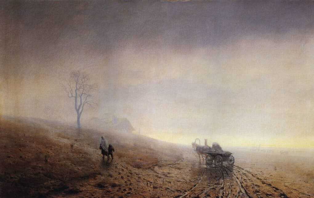 На нем изображена повозка, запряженная лошадью, которая пытается преодолеть размытую дождем дорогу, одиноко стоящее дерево, люди, вдали виднеется поселение.