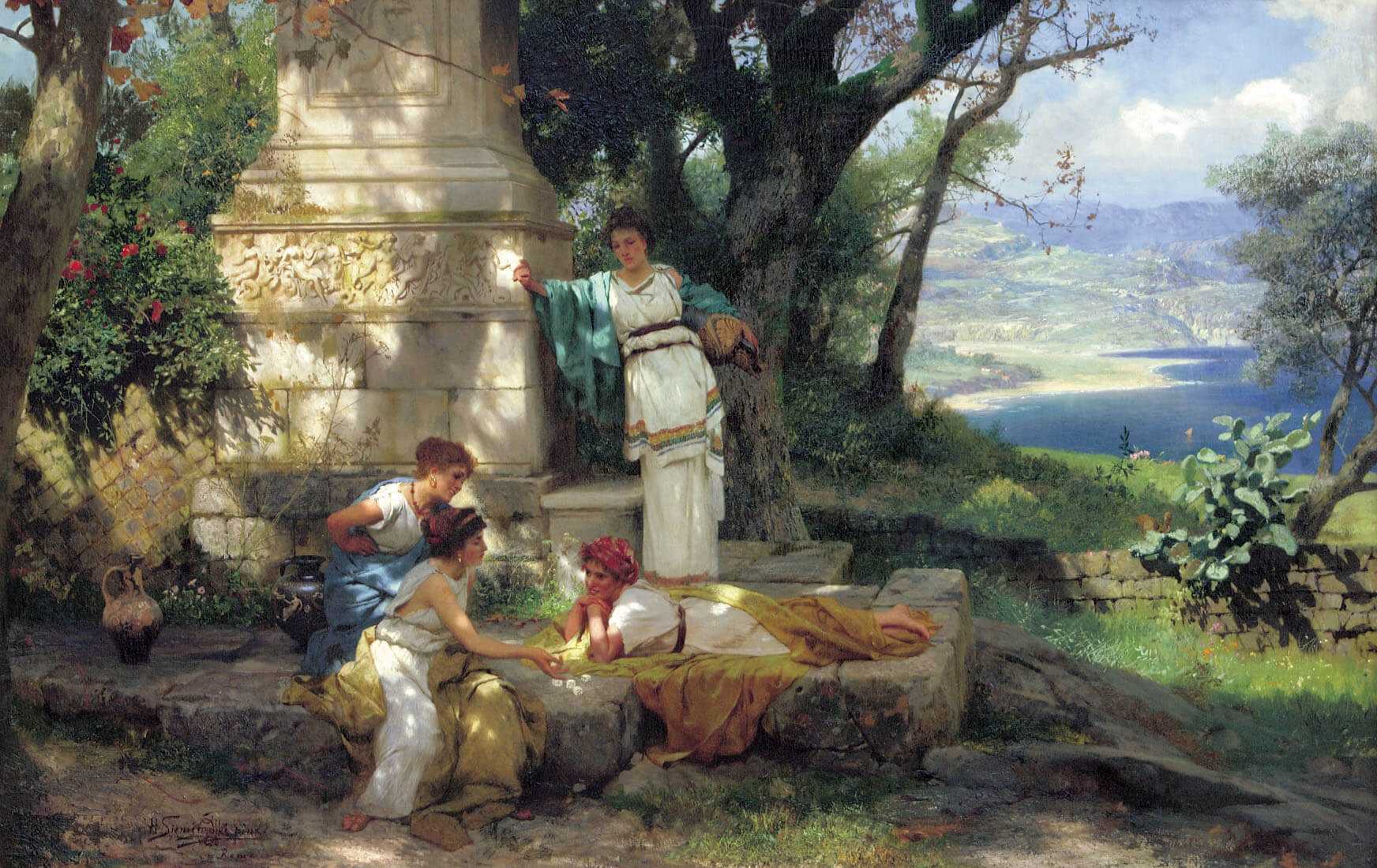 На картине, написанной в 1889 году, изображена жанровая сценка из жизни в античную эпоху. Четыре прекрасные молодые женщины уединились в тени деревьев для приятного времяпровождения – игры в кости. Детали картины создают атмосферу отдыха и безмятежности — греческие кувшины, наполненные вином, и кусты, усыпанные цветами. В центре композиции — лежащие и сидящие девушки, на уходящую ввысь колонну опирается ещё одна красавица.