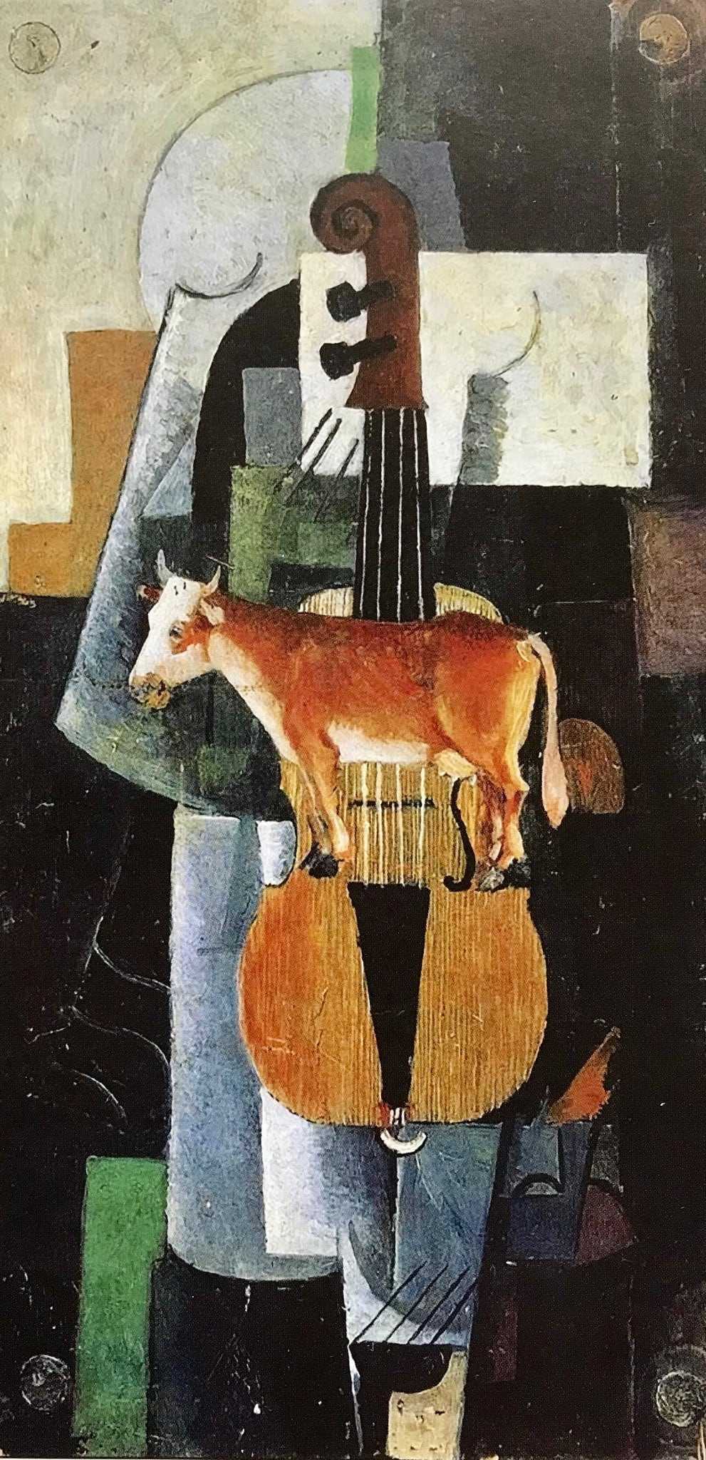 Темный фон картины «Корова и скрипка» говорит о мрачном настроении художника, о его печали. Само произведение – это некий протест против того времени. Тогда литература и живопись должна была соответствовать определенным стандартам, даже музыку писали по правилам.
