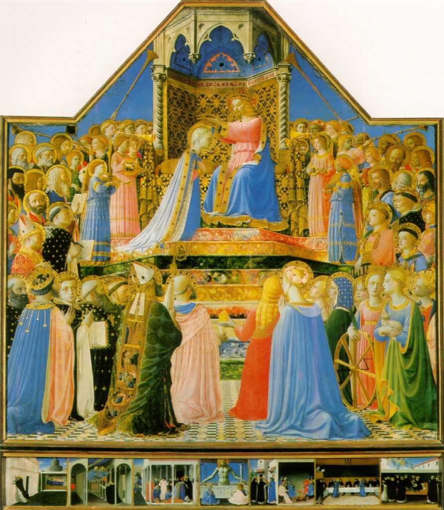 Коронование Марии, около 1433. Дерево, темпера, 209*206 см Лувр, Париж. В итальянском искусстве XIV–XVI века этот сюжет был довольно распространен и чаще всего украшал центральные иконы алтарей. Дева Мария стоит на коленях перед Христом. Помимо идеи прославления Богоматери, здесь присутствует мотив ее заступничества пред Всевышним за род человеческий. Это одно из первых произведений, в котором фигуры на переднем плане обращены к зрителю спиной, словно вовлекая его в происходящее.