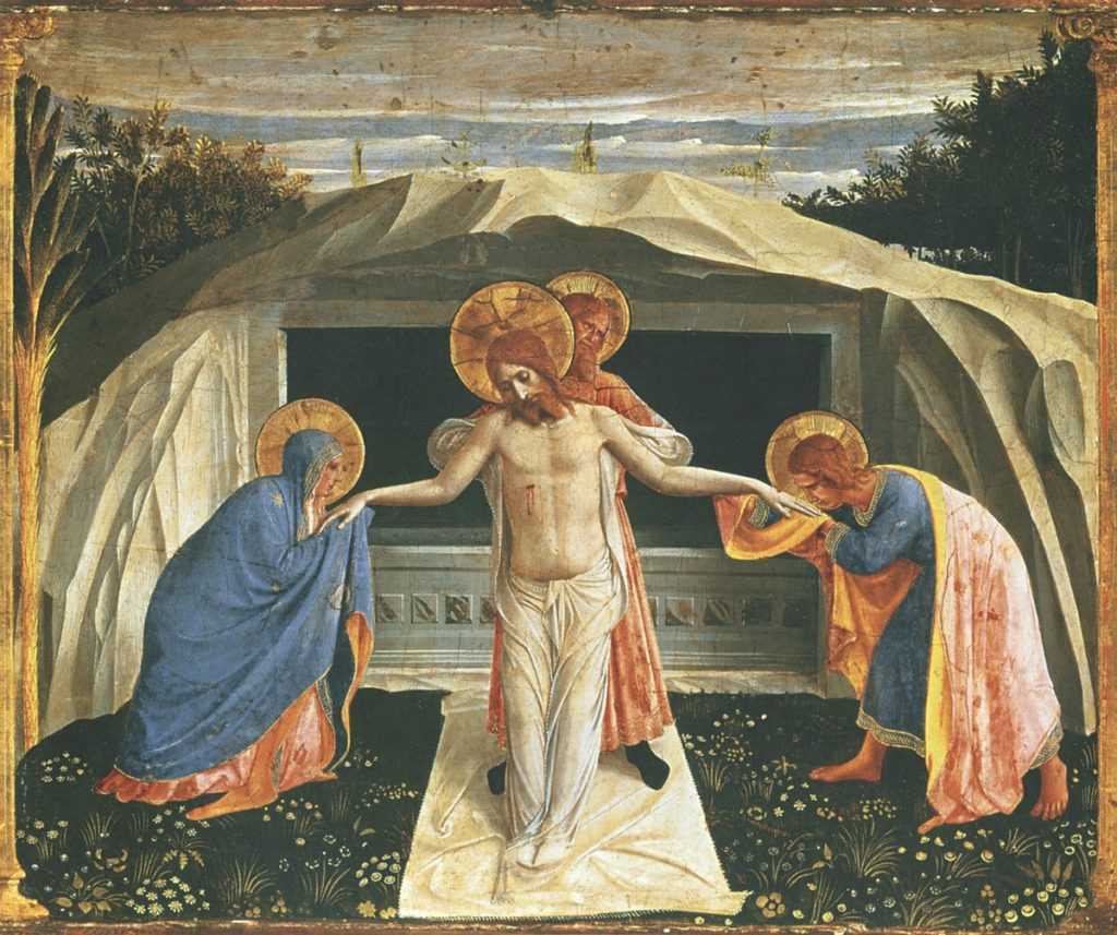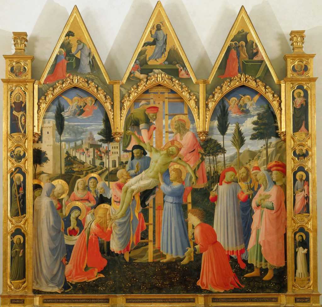 Снятие с креста, около 1430–1440. Дерево, темпера, 185*176 см. Музей монастыря Сан Марко, Флоренция. Работа над иконой, заказанной семейством Строцци для церкви Санта Тринита во Флоренции, была начата Лоренцо Монако, который успел расписать поля фронтонов, и завершена Фра Анджелико. Оформление дальнего плана свидетельствует о том, что он был одним из выдающихся пейзажистов XV века. Благодаря реалистичному изображению пространства и упрощенным архитектурным формам, икона может по праву считаться одним из ключевых произведений раннего Возрождения.
