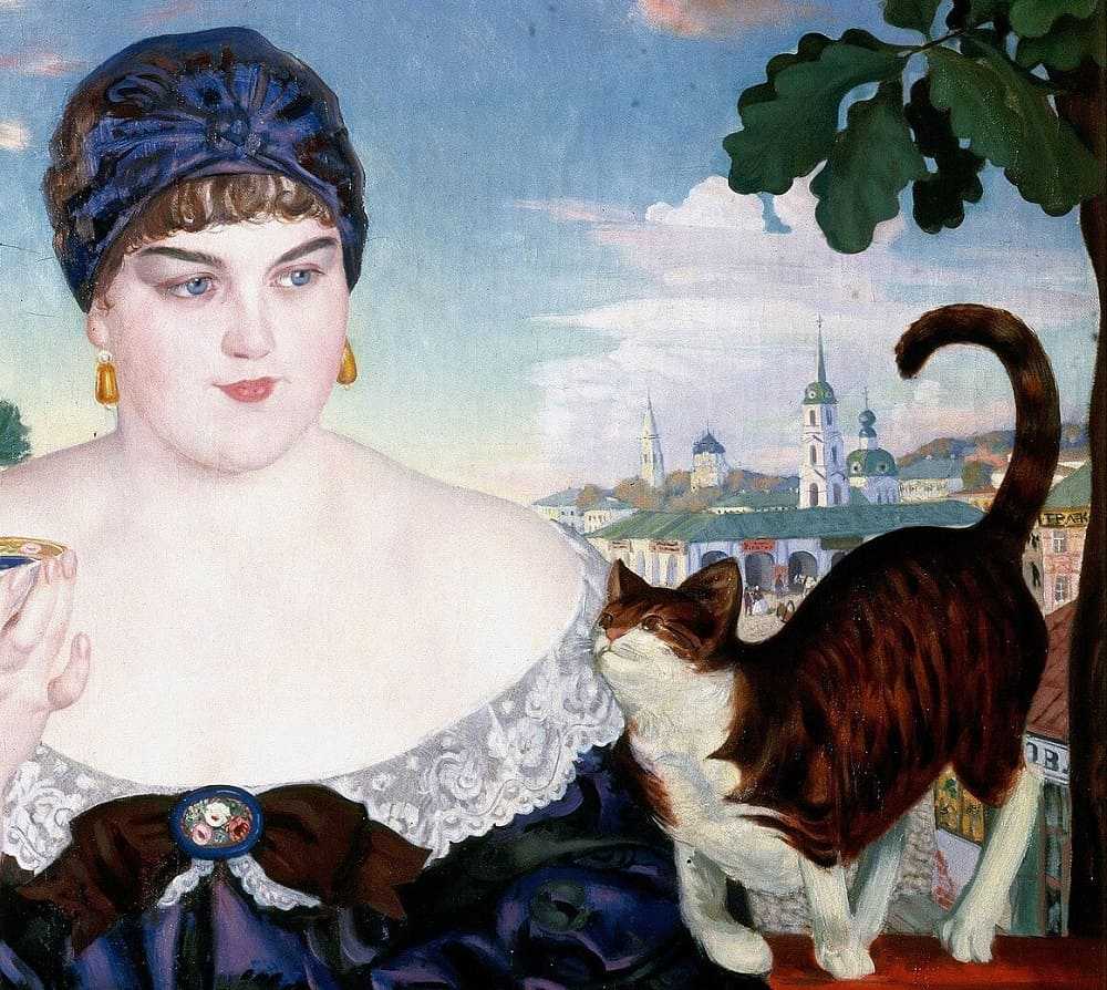 Ещё одним, не менее интересным персонажем, является кот. На мой взгляд, он олицетворяет благожелательность и удовлетворение жизнью, но искусствоведы считаю, что всё гораздо сложнее. В старину кота считали неким «гонцом» от нечистой силы. Если животное появлялось за левым плечом (что мы и видим на картине) – это могло значить только одно: нечистая сила намеревается ввести в искушение эту молодую и красивую женщину. А теперь взгляните на лицо купчихи и взгляд кота. Несомненно, сама героиня полотна Кустодиева не против поддаться соблазну.
