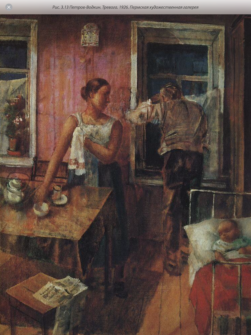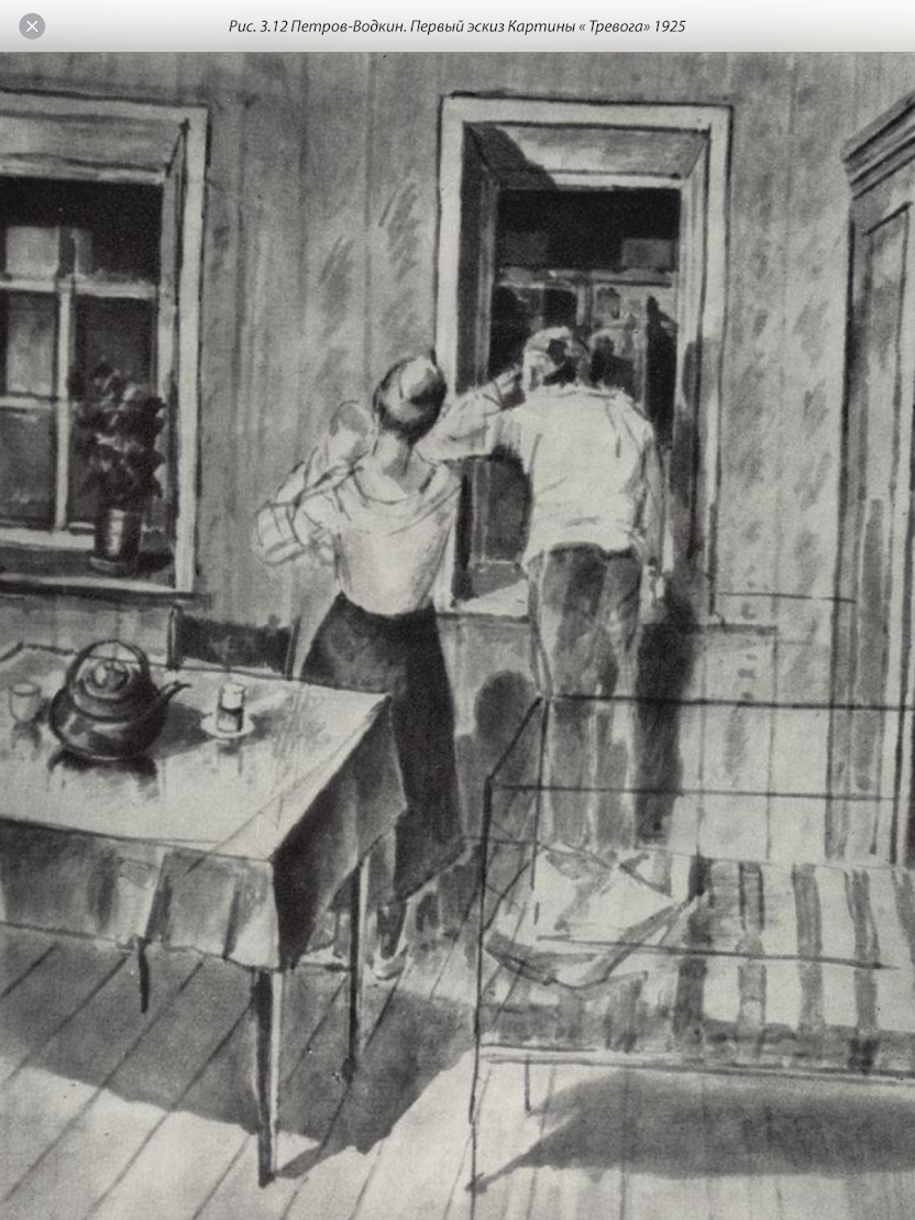«К 1934 году здоровье Петрова-Водкина несколько улучшается, он возвращается к активным занятиям живописью и создает одну из своих лучших картин позднего периода — «1919 год. Тревога» (1934, ГРМ), в которой вновь пронзительно звучит революционная тема. Уже упоминалось, что эскиз этой композиции был написан в 1926 году