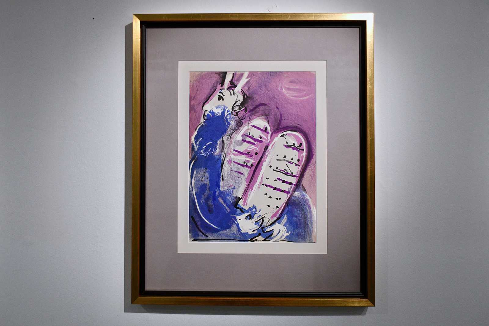 Литографию «Моисей со скрижалями смотрит вверх» разместили почти в самом центре серии из шести работ. Здесь изображен и пророк Моисей, и сам художник: дело в том, что Моисей (или Мойша) — настоящее имя мастера. Марком Шагалом Мойша Сегал стал в Париже.