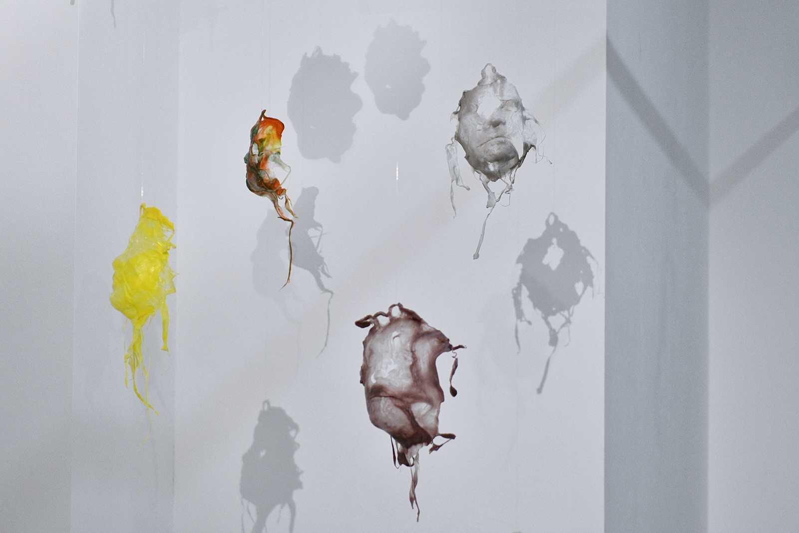 В середине зала развевается большое шелковое полотно — это работа «Обрывки сновидений», созданная Екатерины Бубновой в технике цифровой печати на мокром шелке.