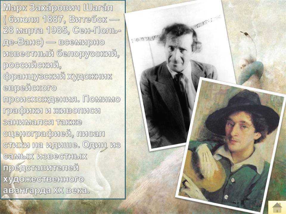 Мойша был старшим из девяти детей и все домашние, а также соседи и торговцы да и простые мужики были тогда его моделями. Деревянные дома, луковки церквушек, бакалейная лавка матери, еврейские заповеди, обычаи и праздники — эта простая и трудная, но такая «основательная» жизнь навсегда влилась в сердце мальчика и образы родного любимого Витебска будут постоянно повторяться в творчестве художника.