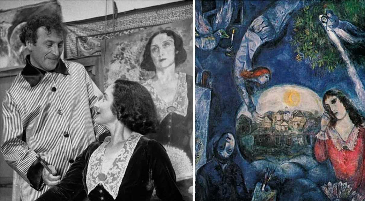 Летом 1909 года в Витебске Марк Шагал познакомился с Беллой Розенфельд, дочерью витебского ювелира.«… Она молчит, я тоже. Она смотрит — о, ее глаза! — я тоже. Как будто мы давным-давно знакомы и она знает обо мне все: мое детство, мою теперешнюю жизнь и что со мной будет; как-будто всегда наблюдала за мной, была где-то рядом, хотя я видел ее в первый раз. И я понял: это моя жена. На бледном лице сияют глаза. Большие, выпуклые, черные! Это мои глаза, моя душа…». Марк Шагал, «Моя жизнь»