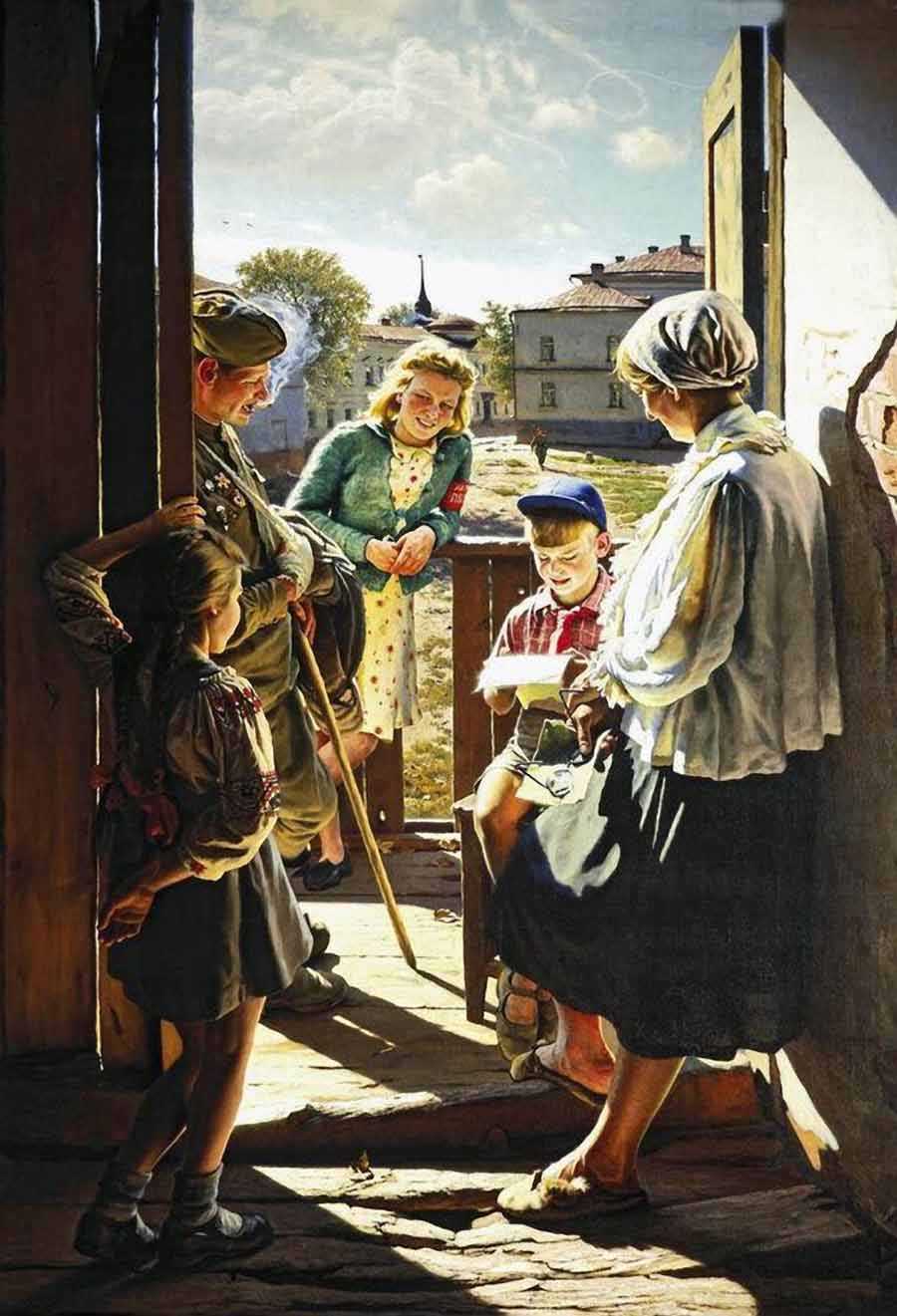 В живописи послевоенного времени сер. 1940 — кон. 1950-х в живописи ведущие позиции занимает тема войны, как нравственного и физического испытания, из которого советский человек вышел победителем. Развивается историко-революционный, исторический жанры. Основной темой бытового жанра становится мирный труд, о котором мечтали долгие военные годы. Полотна этого жанра пронизаны жизнерадостностью и счастьем. Художественный язык бытового жанра становится повествовательным и тяготеет к жизнеподобию. В последние годы этого периода пейзаж тоже претерпевает изменения. В нём возрождается жизнь края, вновь укрепляется связь между человеком и природой, появляется атмосфера умиротворённости. Любовь к природе воспевается и в натюрморте. Интересное развитие получает портрет в творчестве разных художников, для которого характерна передача индивидуального. Одними из выдающихся произведений этого периода стали: «Письмо с фронта» А.И. Лактионова, произведение, подобное окну в лучезарный мир;