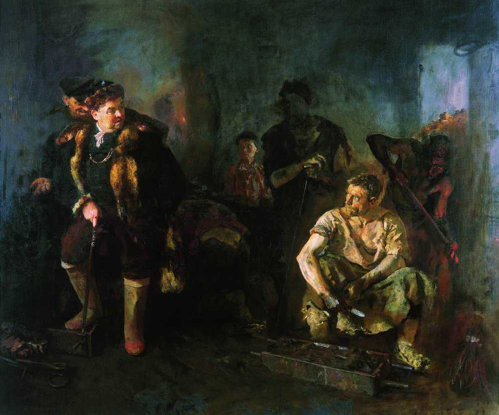 Б. В. Иогансон испытал влияние И.Е. Репина и В.И. Сурикова, в его полотнах виден композиционный поиск и интересные возможности в колористическом решении, но картины автора отмечены излишним сатирическим отношением, неподходящим в столь натуралистической манере, что мы можем наблюдать на примере картины «На старом уральском заводе».