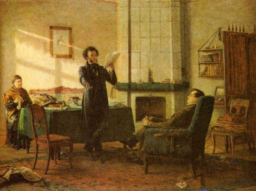 В свой последний год жизни в Петербурге художник Николай Ге, в то время бедствующий и недовольный собой, пишет одну из самых светлых своих работ — картину «Александр Сергеевич Пушкин в селе Михайловском». Два поэта с похожими фамилиями и легендарная няня залиты ярким псковским солнцем — Александр Пушкин, Иван Пущин и Арина Родионовна читают «Горе от ума» Грибоедова.