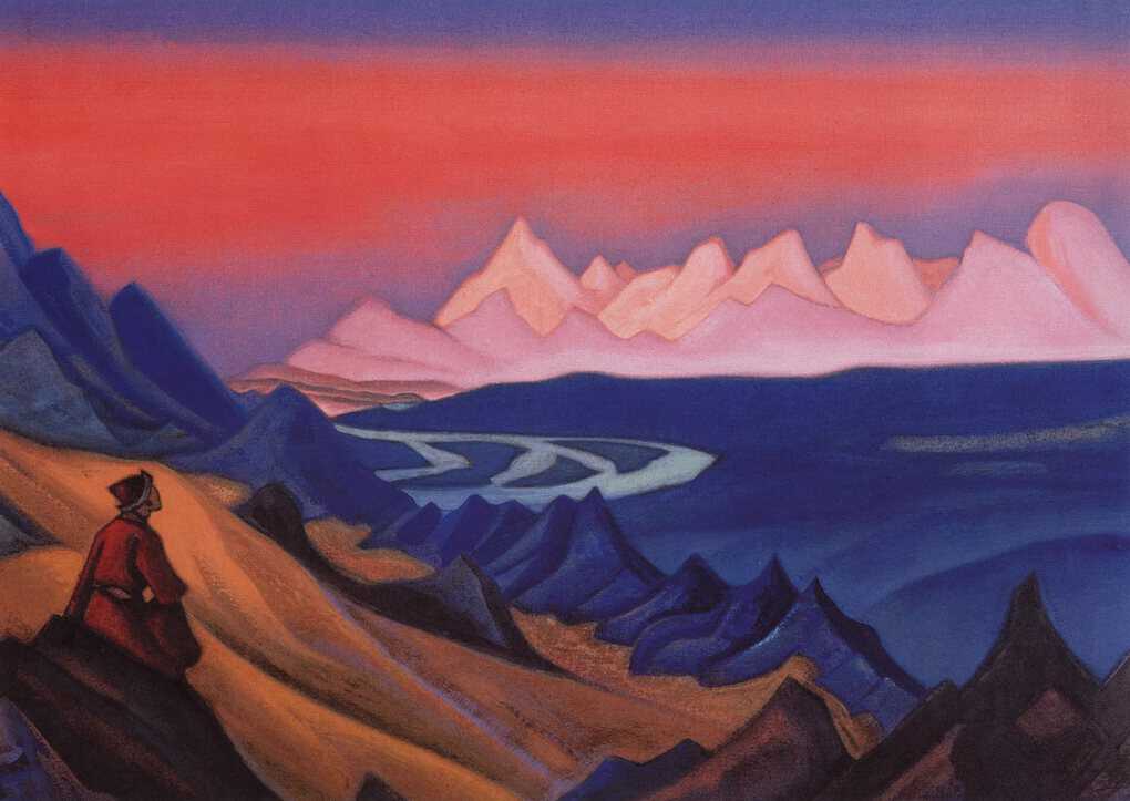 Картина навеяна философскими размышлениями о смысле жизни маленького человека в огромном пространстве мироздания. Внизу простираются реки и ледники, а вдали заснеженные вершины священной горы сияют в лучах заката. Сказочный пейзаж, яркое алое небо, фигурка медитирующего человека — всё это вызывает неповторимые ощущения.
