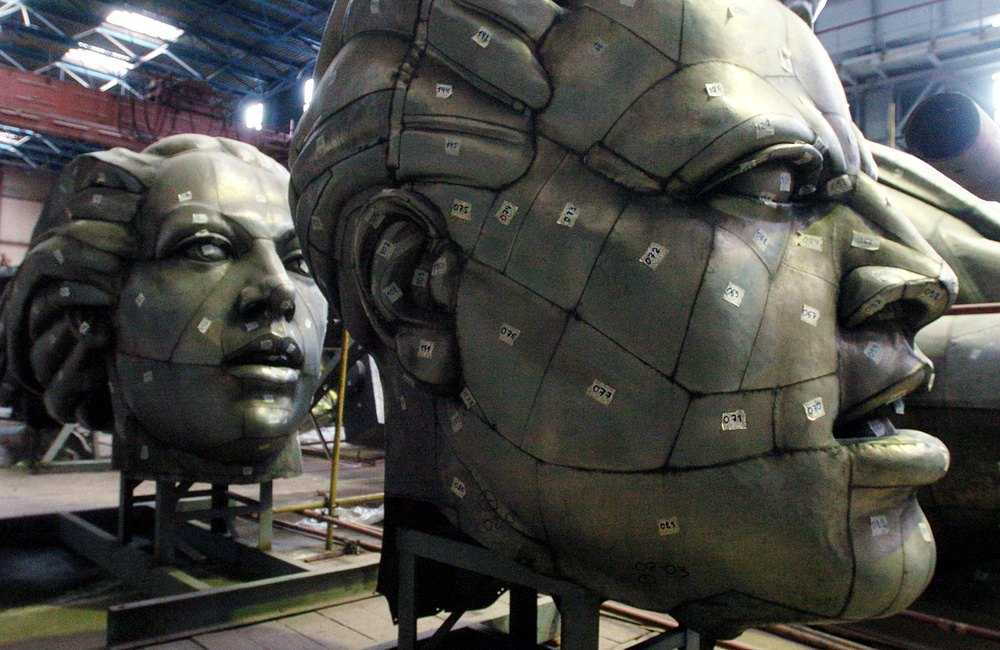 Он взялся увеличить изготовленную копию в 15 раз. Специалист предложил использовать для отливки отдельных деталей хромоникелевую сталь, самостоятельно разработал технологию точечной сварки, чтобы их соединить. Стальные элементы создавали по деревянным шаблонам. Изготовить головы таким способом было невозможно, для их создания были изготовлены специальные глиняные болванки.