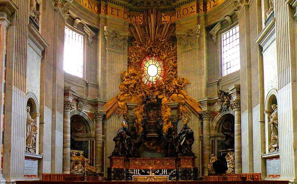 Помимо строительства колоннады, в апсиде главного нефа Ватиканского собора гениальный мастер возвел один из главных своих шедевров – скульптурную композицию Кафедры Святого Петра. Выполненная из позолоченной бронзы, внутри она содержит деревянный трон Святого Апостола – древнехристианскую реликвию, подаренную в 875г. папе Иоанну VIII первым королем западно-франкского королевства Карлом II Лысым.