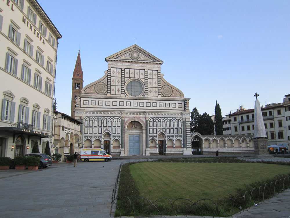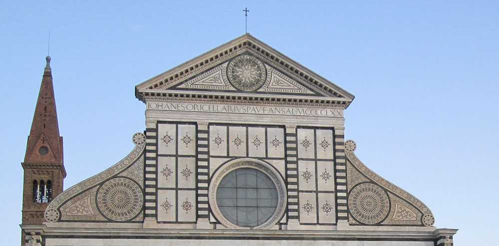Роскошный мраморный фасад церкви Санта Мария Новелла, напоминающий огромную инкрустированную шкатулку, считается одним из наиболее значимых произведений флорентийского ренессанса. Он был выполнен по проекту архитектора Леона Баттиста Альберти в 1456-70 гг. в процессе реконструкции базилики, заказанной одним из богатейших торговцев Флоренции и покровителей искусств – Джованни ди Паоло Ручеллаи. Его имя высечено большими буквами на верхнем фронтоне, а внутри базилики находится посвященная ему капелла.
