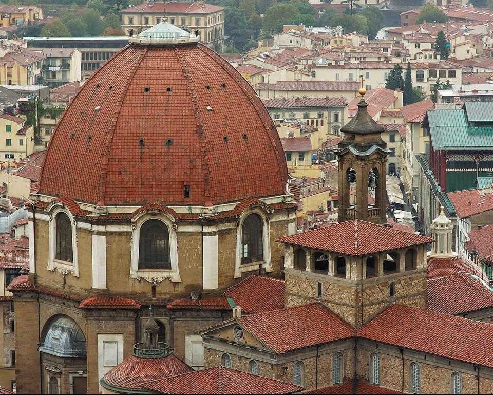 Самый высокий купол базилики Сан-Лоренцо и третий по величине во Флоренции венчает именно Капеллу принцев – усыпальницу рода Медичи. Здесь похоронены все остальные члены легендарной фамилии. Купол расписывал красочными фресками Пьетро Бонвенути, а окна вырезаны так, чтобы максимально выгодно и эффектно освещать старинную роспись.