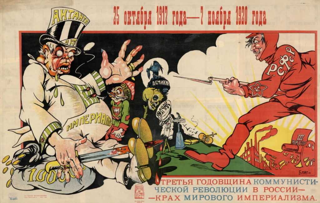 Нужно не забывать, что во время Гражданской войны шла активная интервенция со всех сторон в нашу страну. Западные империалисты были против становления большевизма в России, поэтому они активно помогали белогвардейцам, что отразилось в пропаганде: