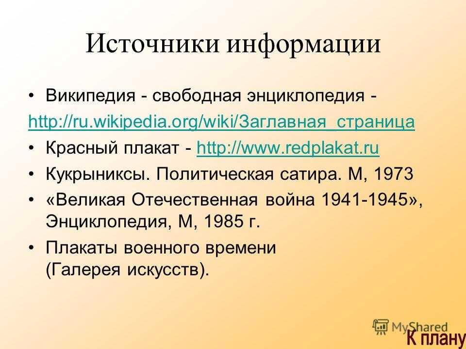 Источники информации Википедия — свободная энциклопедия — Красный плакат — Кукрыниксы. Политическая сатира. М, 1973 «Великая Отечественная война », Энциклопедия, М, 1985 г. Плакаты военного времени (Галерея искусств).
