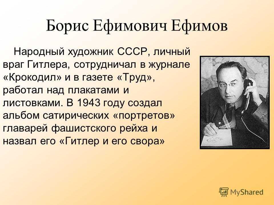 Борис Ефимович Ефимов Народный художник СССР, личный враг Гитлера, сотрудничал в журнале «Крокодил» и в газете «Труд», работал над плакатами и листовками. В 1943 году создал альбом сатирических «портретов» главарей фашистского рейха и назвал его «Гитлер и его свора»