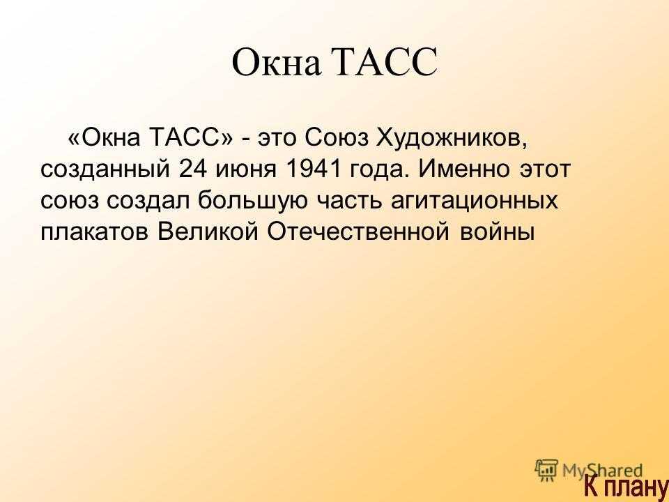 Окна ТАСС «Окна ТАСС» — это Союз Художников, созданный 24 июня 1941 года. Именно этот союз создал большую часть агитационных плакатов Великой Отечественной войны