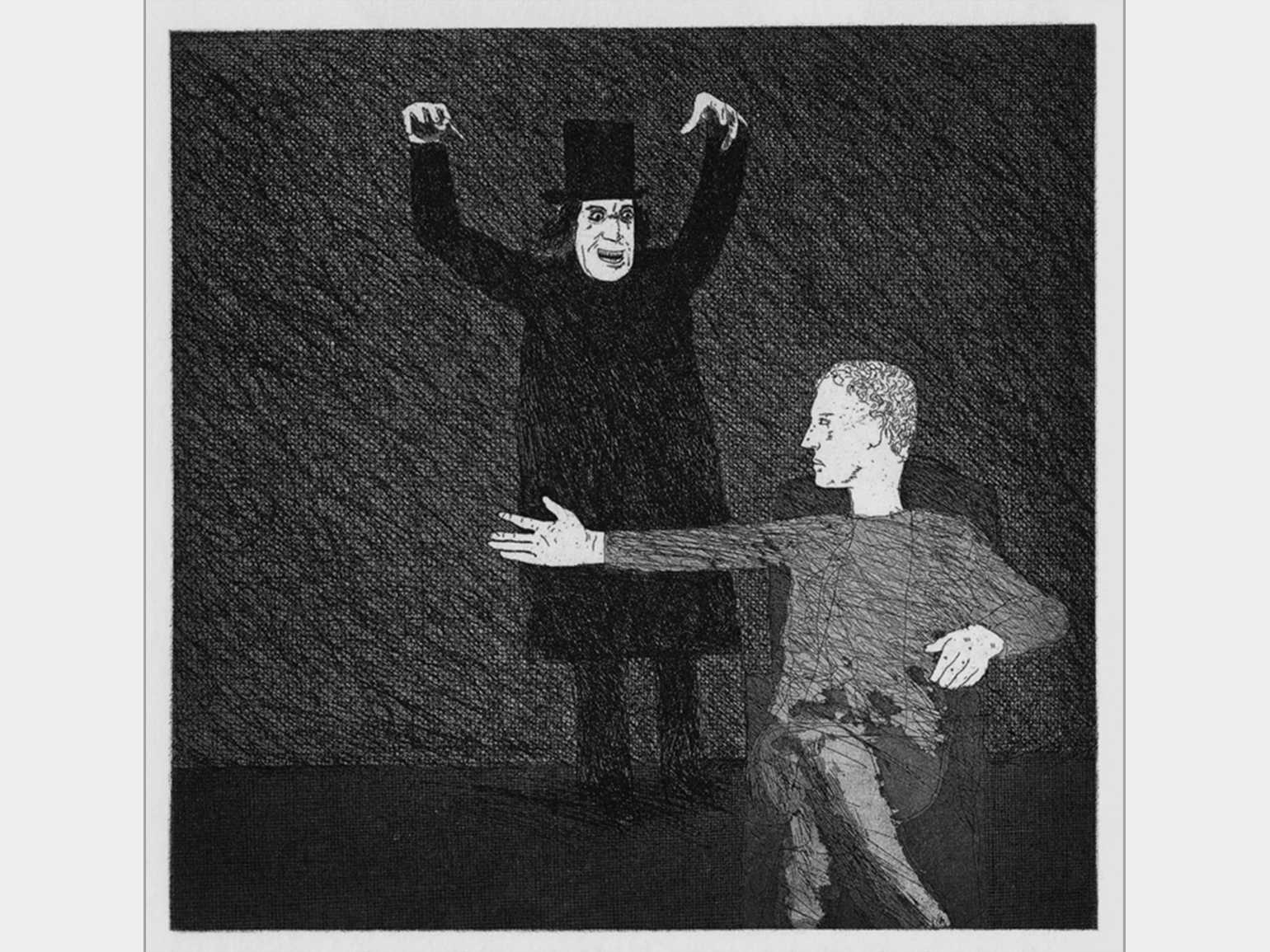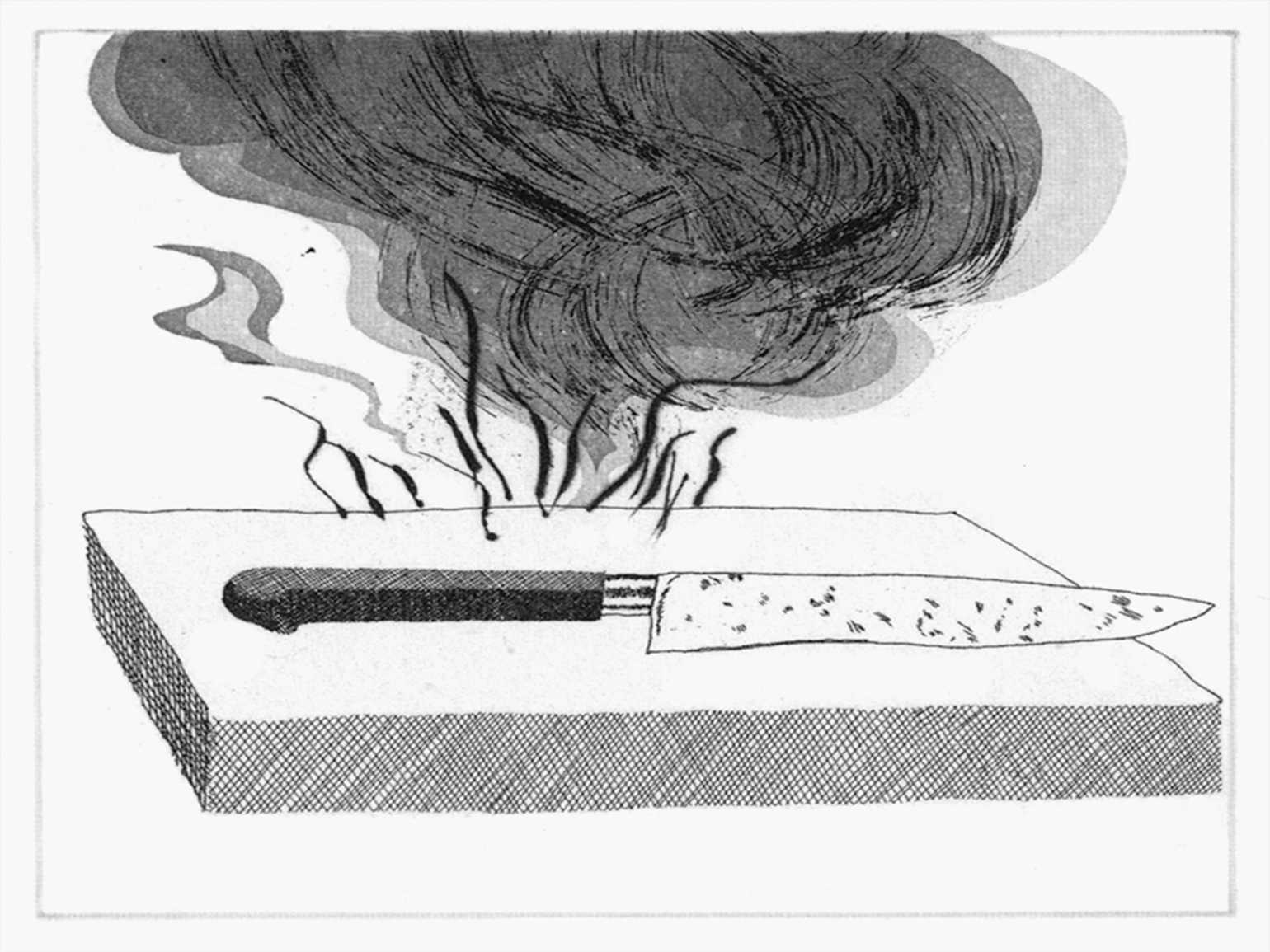 «Верстак, нож и огонь». Иллюстрация: Дэвид Хокни / иллюстрация к сказкам Братьев Гримм