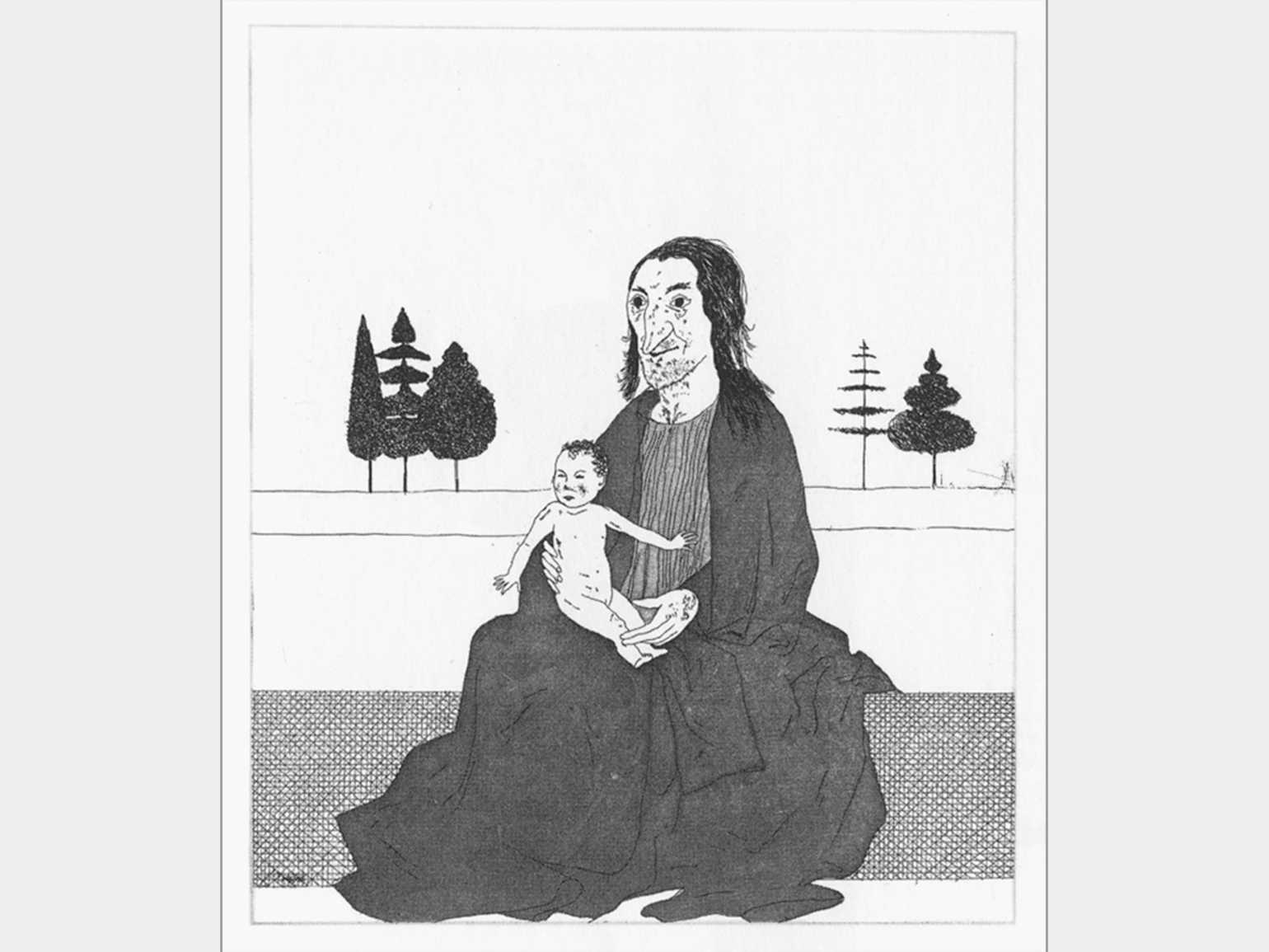 «Ведьма с маленькой Рапунцель». Иллюстрация: Дэвид Хокни / иллюстрация к сказкам Братьев Гримм