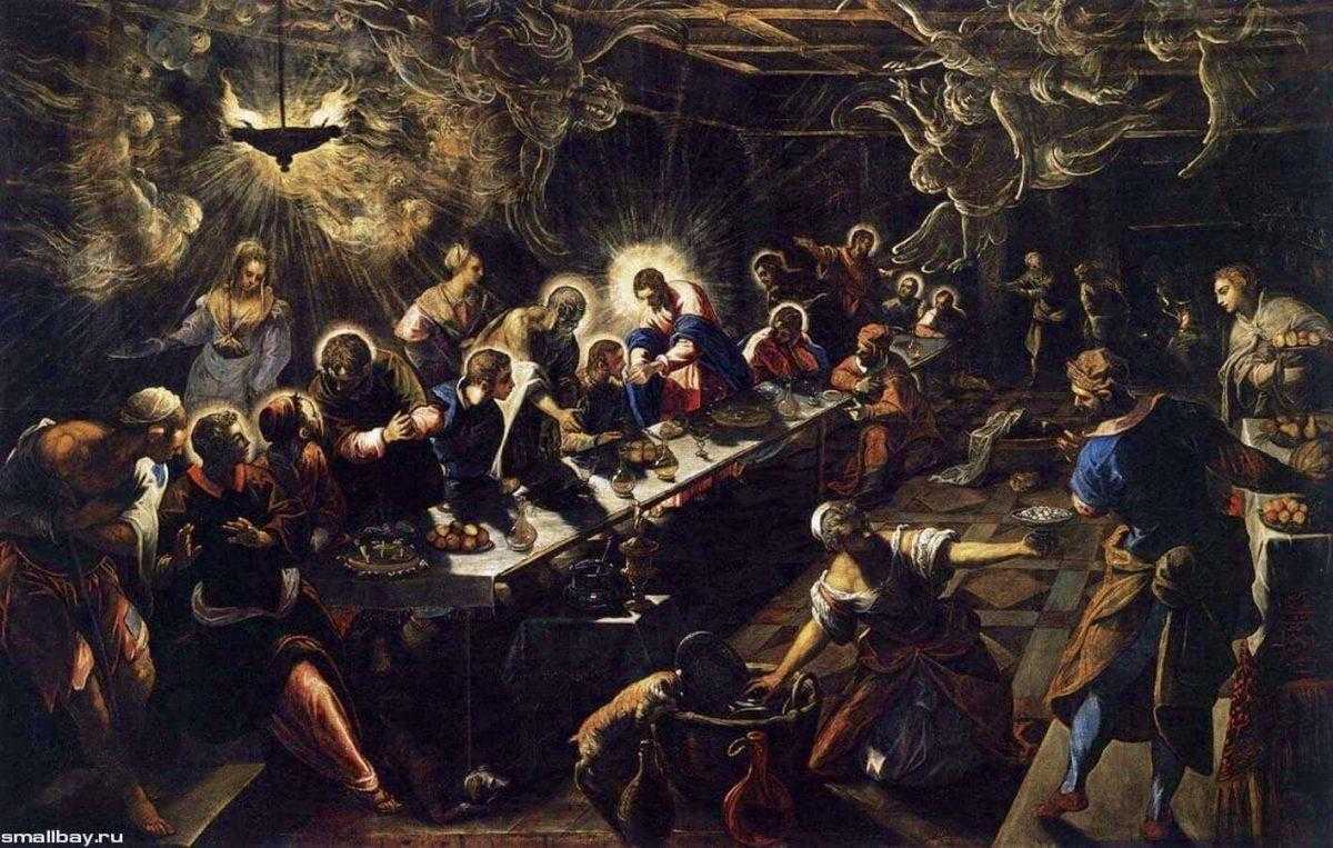 Тема Тайной вечери проходит через все творчество художника. Не менее восьми раз обращался он к ней в разное время. Ранний ее вариант — в церкви Санта-Маркуола (1547) — еще близок к традиционному решению: действие разворачивается параллельно плоскости стены, оно торжественно и неторопливо, композиция симметрична. Тема Тайной вечери проходит через все творчество художника. Не менее восьми раз обращался он к ней в разное время. Ранний ее вариант — в церкви Санта-Маркуола (1547) — еще близок к традиционному решению: действие разворачивается параллельно плоскости стены, оно торжественно и неторопливо, композиция симметрична. От того, первого, полотна «Тайная вечеря» для церкви Сан-Тровазо (1566) отличается разительно. Действие происходит в мрачном полуподвальном помещении таверны, свет в которое скупо проникает откуда-то из глубины. За небольшим квадратным столом, который художник изобразил под углом к плоскости картины, на простых соломенных стульях сидят апостолы — бедные люди в потертых одеждах. Живописец изобразил эмоциональный порыв, охвативший учеников в момент, когда Иисус сказал, что один из них предаст Его. С поразительной экспрессией передает Тинторетто смятение учеников, испуг будущего предателя — Иуды. Совершенно иначе трактуется мотив Тайной вечери в картине для церкви Сан-Джорджо Маджоре, которую Тинторетто закончил незадолго до своей кончины. Художник запечатлел в картине момент, когда Христос преломляет хлеб и произносит слова: «Сие есть тело Мое». Сцена проникнута глубокой одухотворенностью и мистическим волнением, охватившим всех сидящих за пасхальной трапезой. Действие разворачивается в бедной таверне, пространство которой, тонущее в полумраке, кажется безграничным; это впечатление создается, главным образом, благодаря длинному столу, изображенному под углом к плоскости картины. Для усиления царящей за столом таинственной и напряженно-взволнованной атмосферы происходящего чуда художник прибегает к контрасту — на переднем плане справа он изображает несколько предметов и фигур, совершенно не связанных с сюжетом: на полу стоят кувшины и корзина с провизией, в которую заглядывает кошка; хозяин таверны разговаривает о чем-то со служанкой, еще одна женщина снимает со стола чашу с фруктами. Важнейшую роль в композиции играет свет. Сумрачное помещение освещено сияющим нимбом Христа и колеблющимся пламенем светильника. В его мерцающем холодном зеленовато-золотистом свете плавают причудливые, мистические тени. В правом же, само темном углу картины, словно раздвигая пространство, возникают похожие на призраков летящие ангелы.
